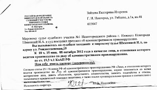 Но даже для нижегородских судов дело, в котором кроме протокола без свидетелей нет ни одного доказательства персональной вины гражданина, - это слишком. Видимо, поэтому и решили подписать постановление задним числом, не извещая обвиняемого о каких-либо действиях. Когда он узнает о решении - поздно будет что-либо обжаловать. А что не известили - так то "Почта России" виновата, сами знаете как работают.